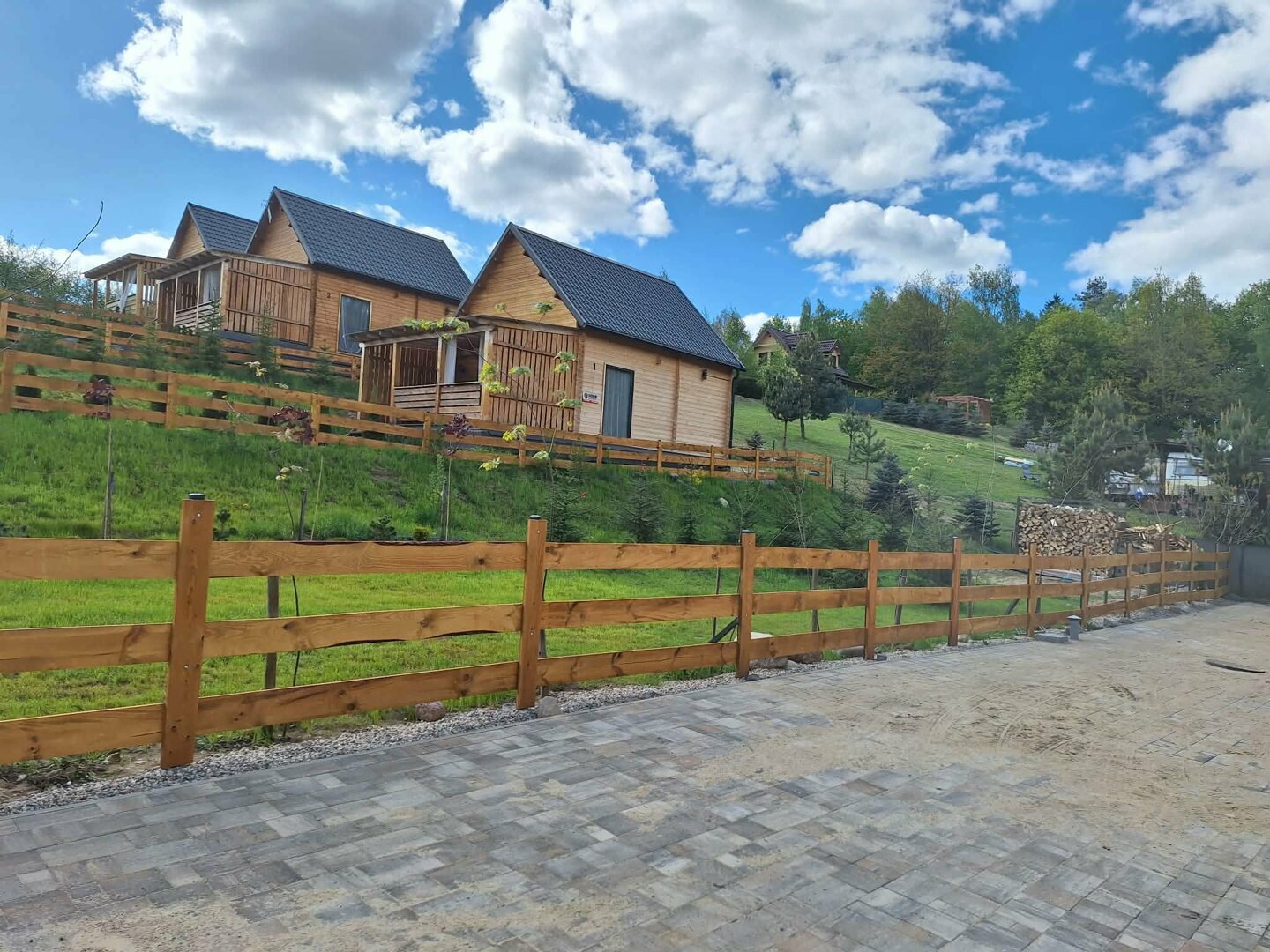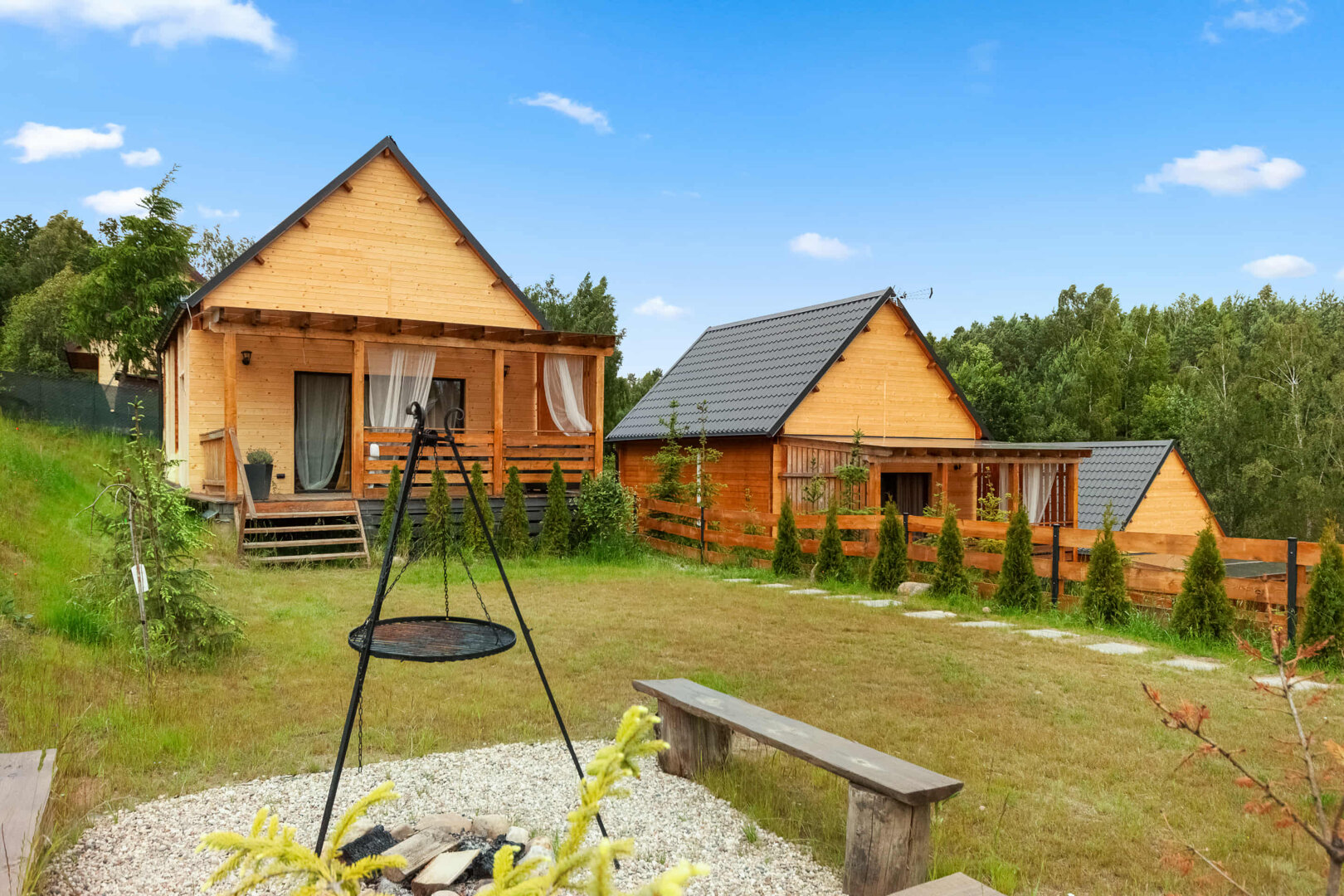 Domek nr 3 "ZŁoty" ma ok 55m2. Posiada na parterze: sypialnię małżeńską, salon z rozkładaną sofą, aneks kuchenny, łazienkę. Na piętrze antresolę z miejscem do spania dla dwóch osób (dwa pojedyńcze materace). Salon ma wygodną sofę oraz duży stół w części jadalnianej. Kuchnia posiada pełne wyposażenie w naczynia, sztućće, garnki, płytę indukcyjną oraz dużą lodówkę z zamrażarką. Przygotowywanie posiłków to u Nas przyjemność. Domek ma duży zadaszony taras z wygodnymi meblami ogrodowymi odpowiednimi do odpoczynku oraz biesiadowania. Grill oraz miejsce na ognisko znajduje się przy domku i jest do prywatnego użytku.